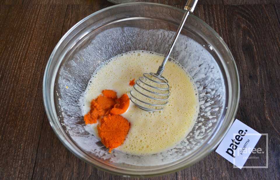 - Яйца взбиваются с сахаром и смешиваются с тыквой.