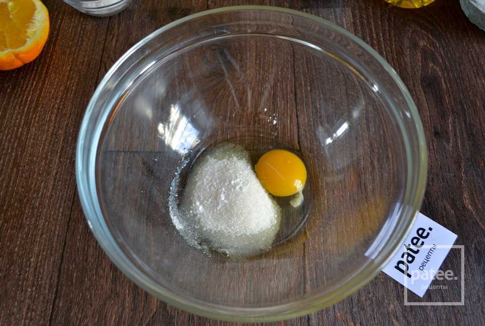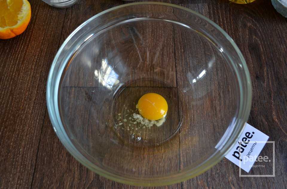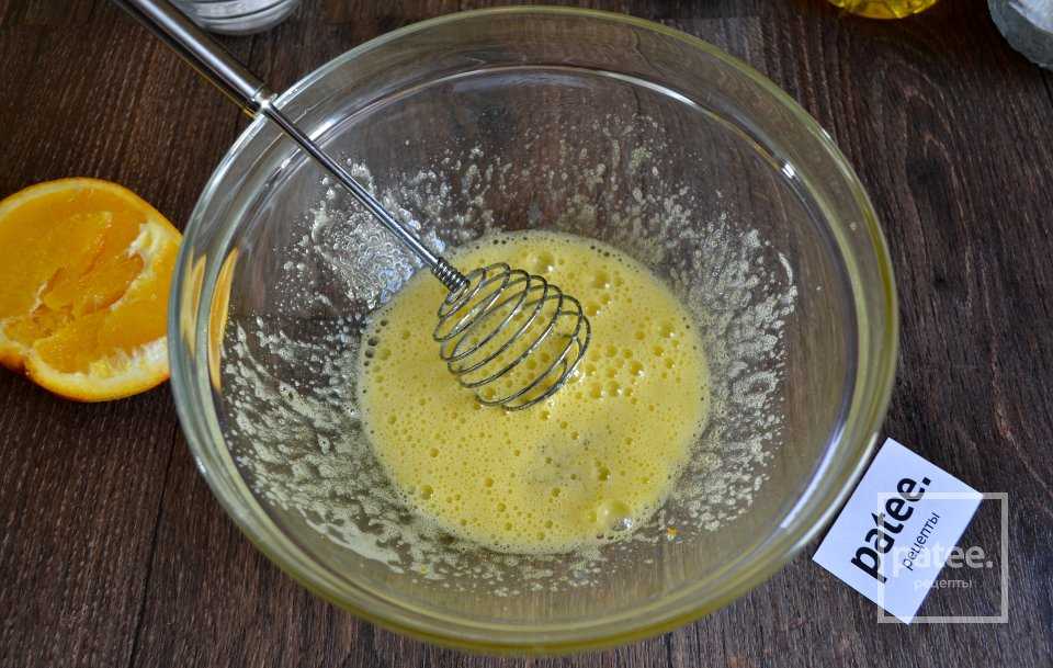 Яйца взбить с солью до лёгкой пенки. Добавить сюда же сок апельсина, а также ту смесь, что мы приготовили с цедрой.