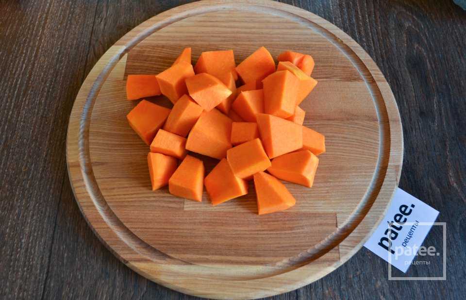 Тыквенную мякоть нарежьте крупными кубиками и отварите в слегка подсоленной воде. После закипания варите 20 минут. Чтобы сэкономить время, можно запечь тыкву в микроволновке. Для этого её нарезать тонкими ломтиками и выложить на тарелку. Закрыть пищевой плёнкой и запекать на максимальной мощности 7 минут. После того, как тыква будет готова, её превратить в пюре. Для этого можно использовать блендер или обычную толкушку.