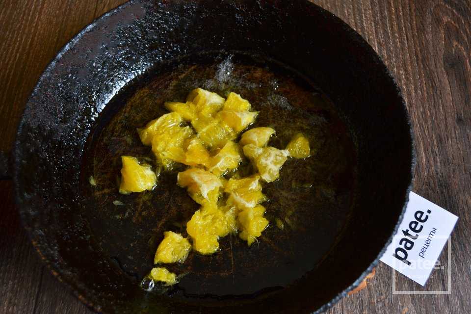 На сковороде растапливаем сливочное масло, добавляем сюда сахар, цедру апельсина, перемешиваем.
