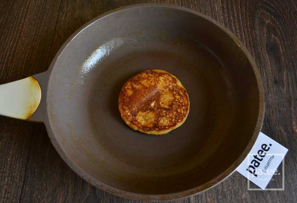 - Сковорода разогревается, смазывается растительным маслом и на нее столовой ложкой выкладываются тесто. Блины достаточно обжарить по 3 минуты с обеих сторон на среднем огне.
