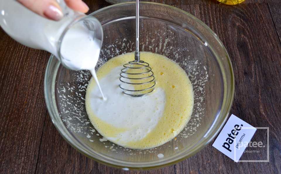 Всё хорошо перемешать. Просеять муку, добавить к этой смеси. Всё перемешать венчиком так, чтобы получилась густая смесь без комочков. Если получится слишком густо, влить остатки молока.