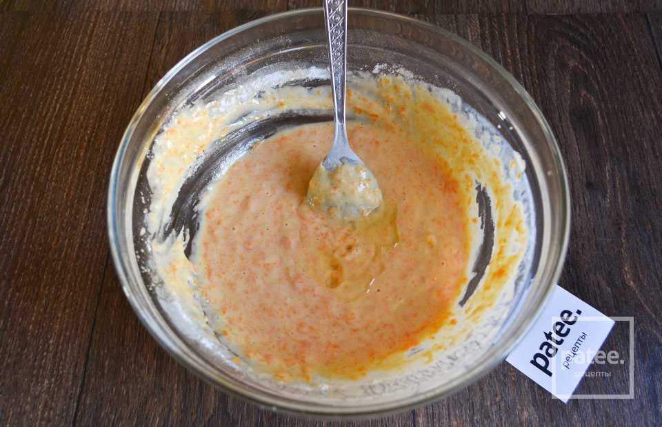 В поднявшуюся опару наливаем сыворотку, добавляем овощное пюре и сырые яйца, все перемешиваем. Постепенно подсыпаем муку, пока не получится тесто нужной консистенции. Тесто для этого вида блинчиков не должно быть слишком жидким, оно похоже на густой кефир.