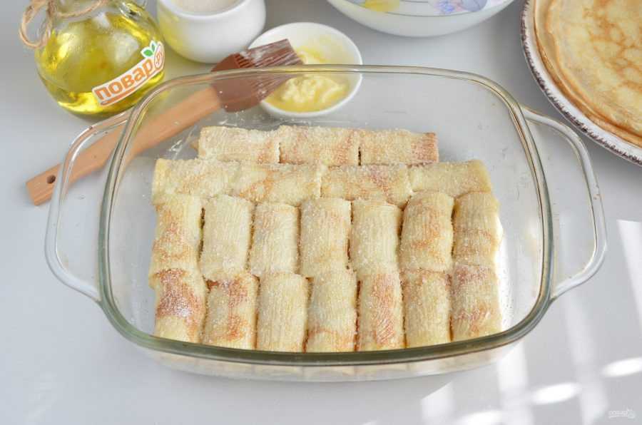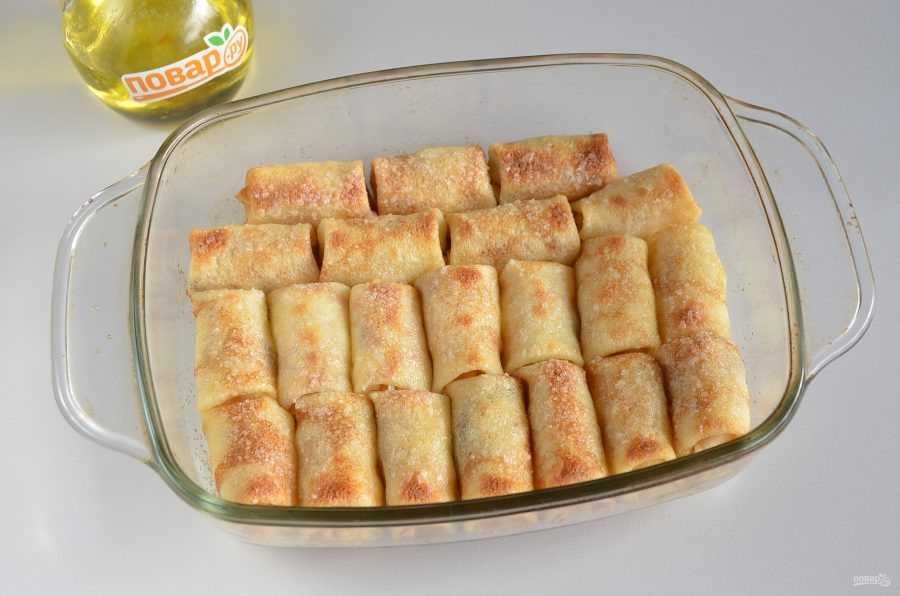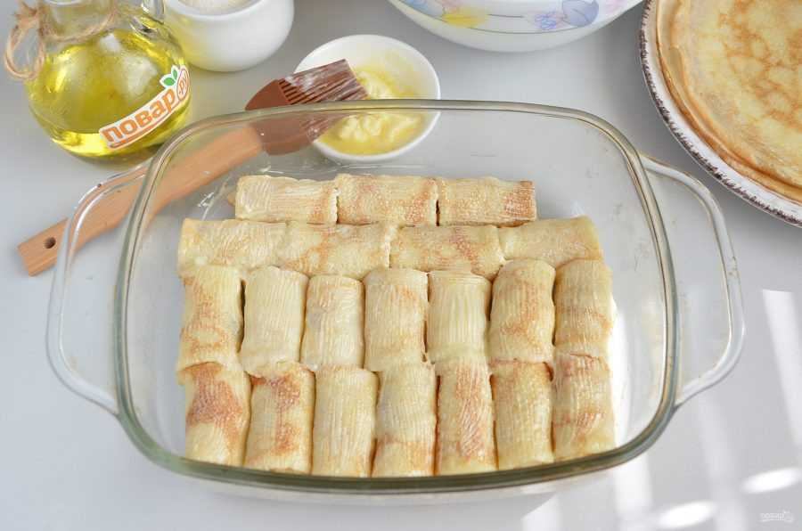 Форму для запекания смазать маслом. Выложить туда все блины – трубочки с начинкой. Поставить в духовку при температуре 200 градусов на 20 минут. Дожидаемся того момента, пока наши блины не подрумянятся и не покроются хрустящей корочкой.