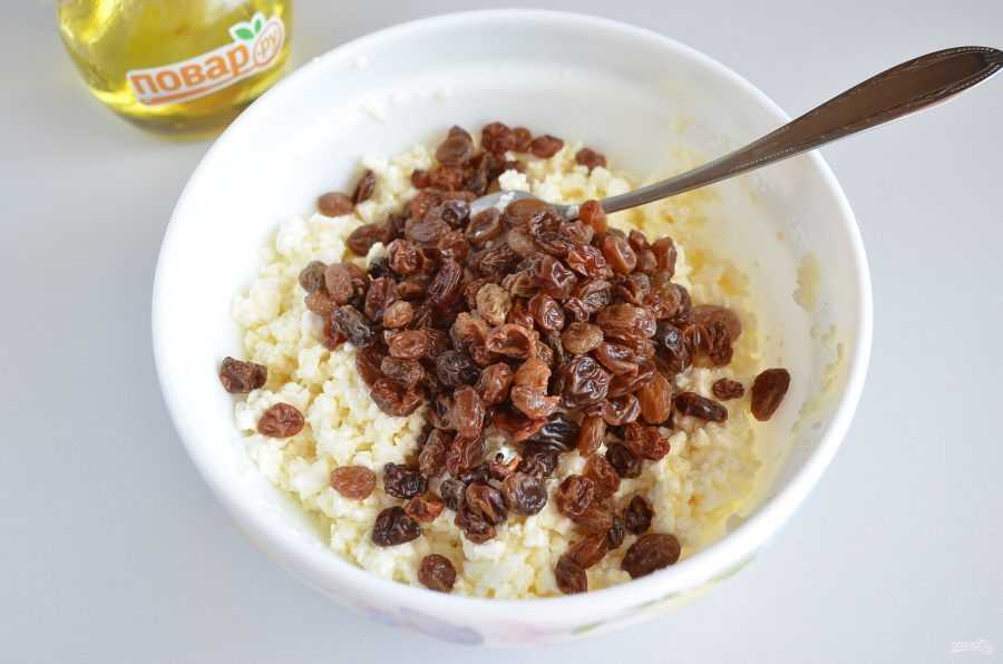 Перед добавлением в творог, изюм нужно запарить в кипятке, чтобы он размяк и напитался — так он будет сочнее.