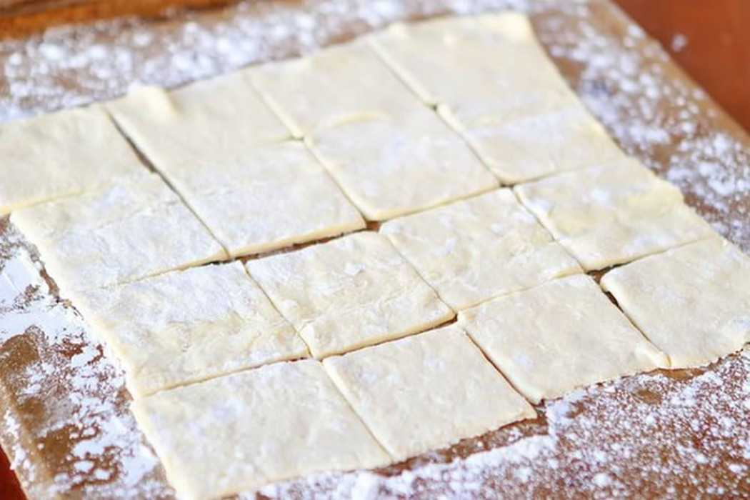 Пласты слоёного теста размораживаем, затем припыляем мукой и раскатываем, разрезаем на квадраты 10 на 10 сантиметров.