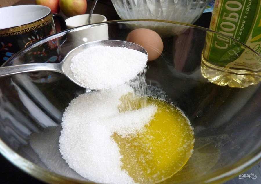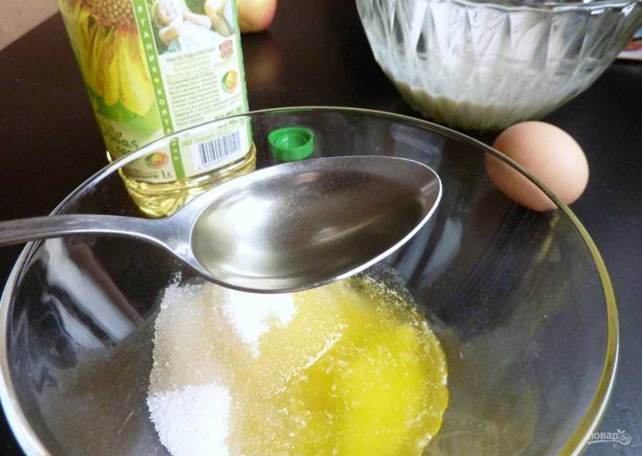 3. Тем временем в отдельную миску добавляю 30 грамм растопленного сливочного масла, 4 столовые ложки сахара.
