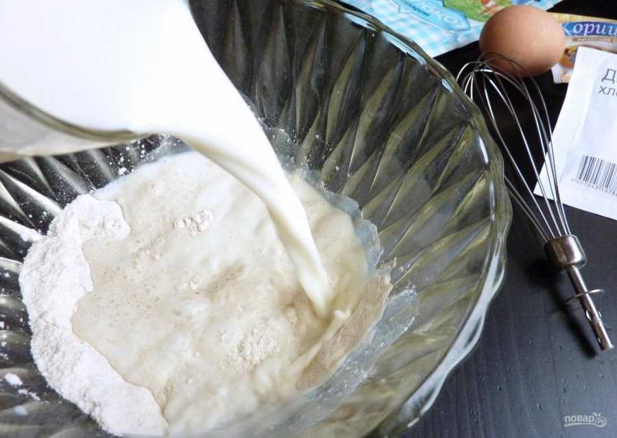 - Дрожжи смешайте с теплым молоком, добавив 200 г муки и 1 ст. л. сахара. Смесь должна постоять минимум полчаса.