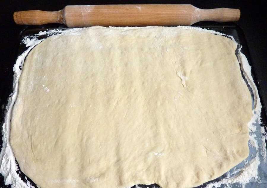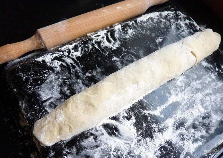 Замесите некрутое тесто и добавьте три столовых ложки растительного масла. Поставьте посуду в теплое место минут на 20. Когда время истечет, раскатайте тесто в большой пласт и нарежьте его на длинные полоски.