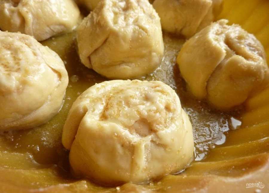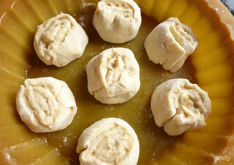 Противень смажьте маслом. Выложите на него кусочки теста с начинкой. Чтобы придать тесту форму розочки, зажмите нижнюю часть пальцами и склейте между собой несколько слоев. Поставьте противень в теплое место для подъема на 35-40 минут.