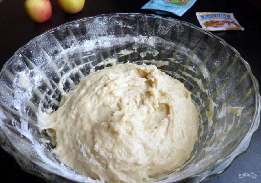Когда дрожжи начнут бродить, на поверхности появятся пузырьки. Вылейте растопленное масло, постепенно досыпайте муку. Если неудобно замешивать в посуде, выложите на стол. Не сыпьте сразу много муки, так как тесто должно быть довольно жидким, примерно как на вареники.
