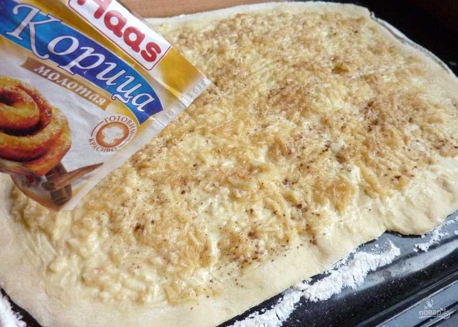 Скатайте тесто в прямоугольник, посыпьте сахаром, корицей, а затем скатайте в рулет. Отрезайте от него небольшие кусочки, шириной 2-3 см.