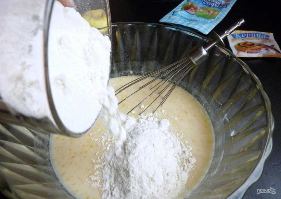 7. Муку заранее просеиваю, чтобы выпечка была пышной и воздушной, всыпаю ее порционно и все время перемешиваю.