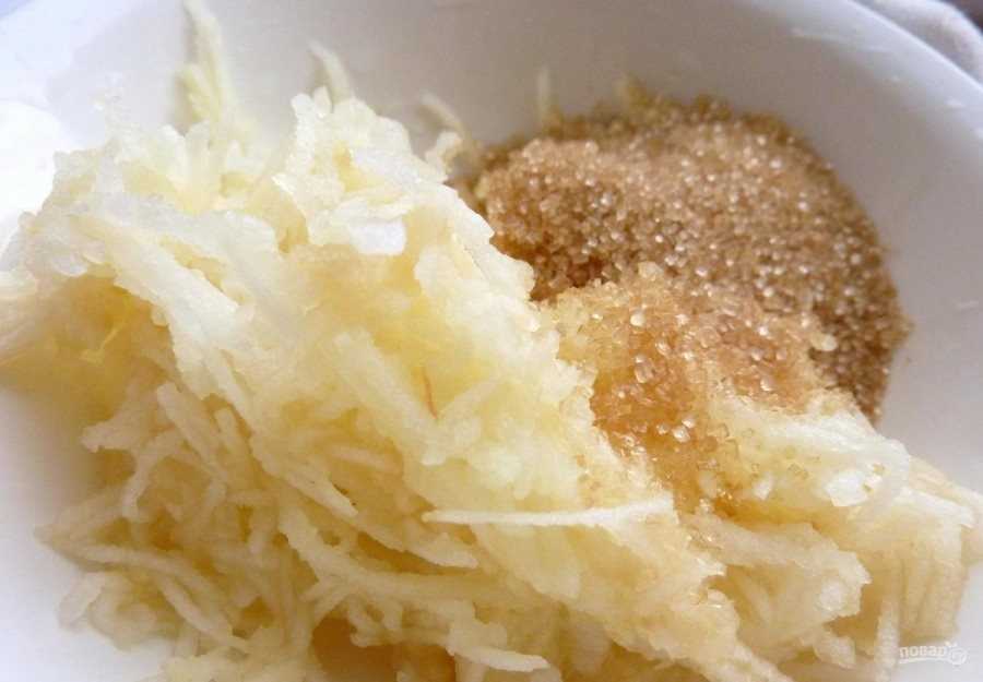 12. Яблоко мою и разрезаю, вычищаю семечки и снимаю кожуру, измельчаю его на мелкой терке, добавляю к нему сахар и перемешиваю.