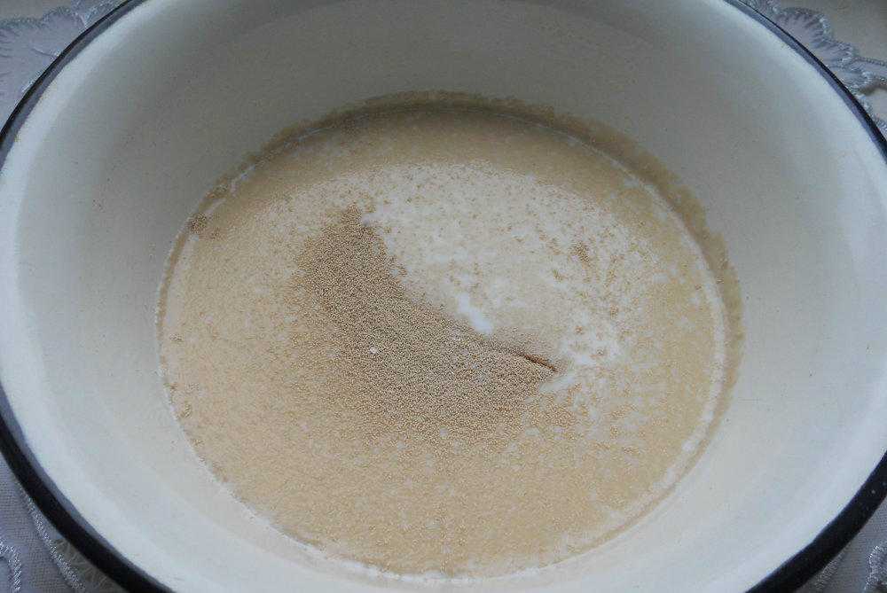 Приготовить стакан теплого молока, добавить дрожжи, сахар, перемешать. Поставить его (не накрывая) в теплое без сквозняков место.