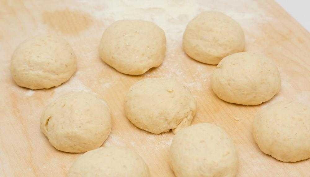 Увеличившееся в размере тесто разделить на 15 частей и скатать в шарики. Заготовки разложить на противень, смазанным жиром. Прикрыть полотенцем.