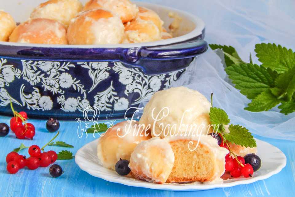 - Готовые булочки выложить на блюдо и помазать заливкой.