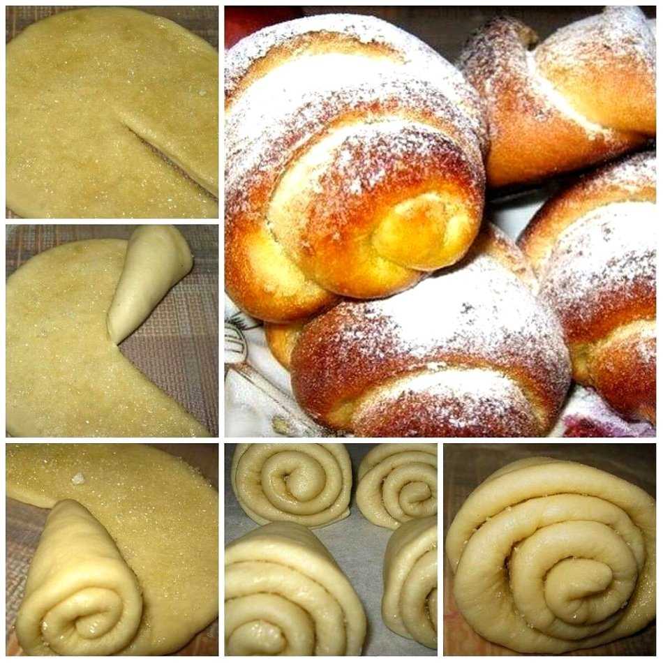 - Подошедшие минут 15 булочки смазываем желтком, даем им испечься, остыть и посыпаем сахарной пудрой.