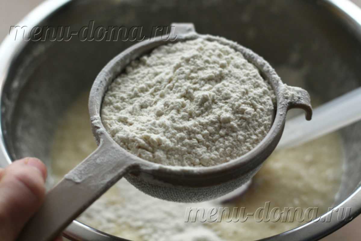 - Просеиваем муку, отправляем большую ее часть к опаре и замешиваем. Когда достигнем состояния однородности, можно добавить оставшуюся муку и замесить до полного загустения.