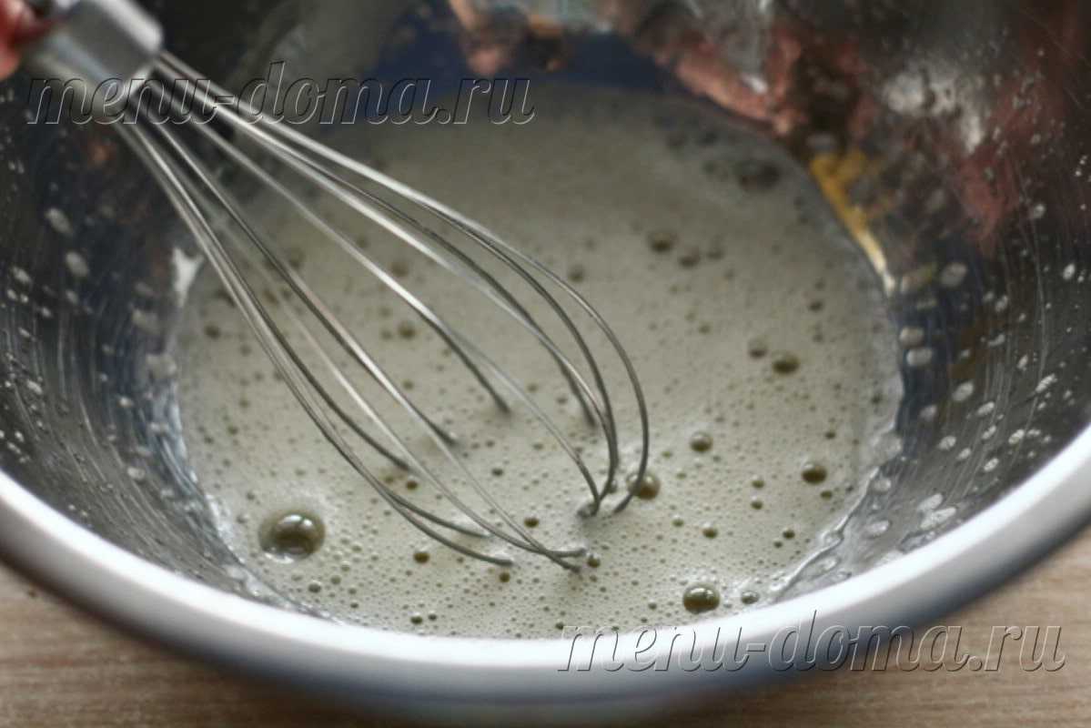 | -2- Всю порцию муки просейте в отдельную емкость. Добавьте в опару примерно 2-3 ложки, перемешайте венчиком. Получившаяся масса по консистенции должна напоминать тесто на оладьи. Прикройте опару салфеткой и отставьте в сторону на 15-30 минут. Чем свежее и качественнее дрожжи, тем меньше времени понадобится на созревание опары. |  |