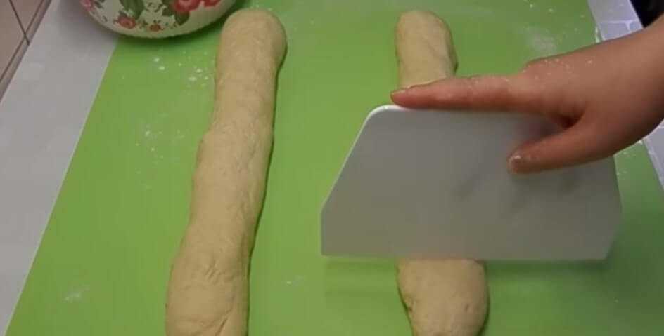 Делим тесто на две части. Каждую из которых скатываем в длинную колбаску. И теперь пытаемся нарезать одинаковые кусочки из которых будем формировать пышки.