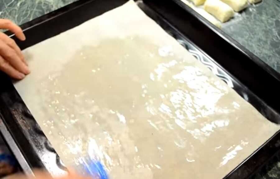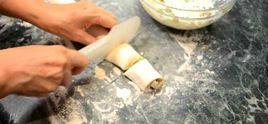 Как только тесто разморозится и станет податливым, его можно будет раскатывать в прямоугольный пласт. На него нанесем начинку, чтобы хорошо залепить края, нужно отступить от краев 1 сантиметр и затем свернуть рулетом.