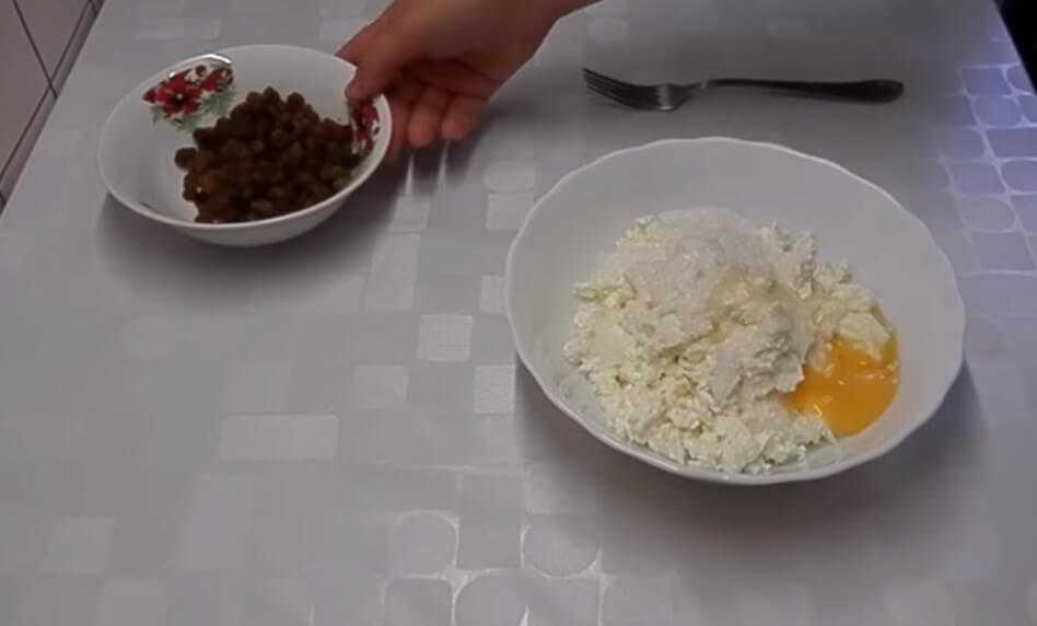 К творогу высыпаем сахар, ванилин, вбиваем яйцо и выкладываем изюм. И хорошо перетираем вилкой.
