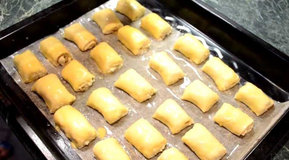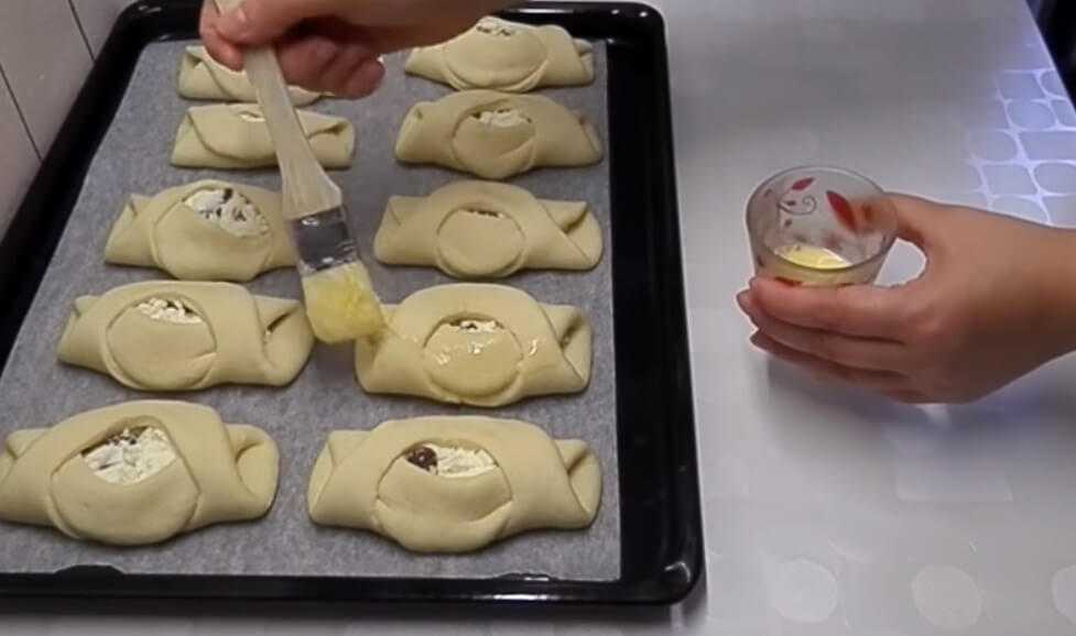 - Выложить в отверстия начинку, а края смазать взбитым желтком.