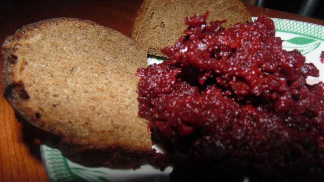 - Перемолотую массу отжать в отдельную посуду, остатки соединить с мелко рубленным луком, ложкой воды, винным уксусом (30 мл), толченым шафраном.