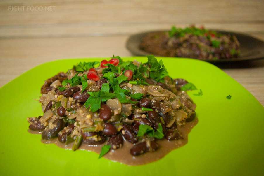 Готовую фасоль выложить на блюдо, сверху положить ореховый соус.