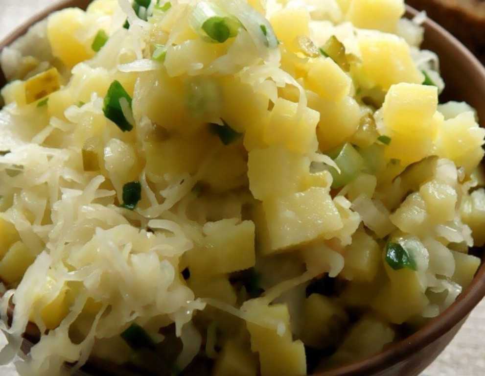Добавить аналогично измельченные два средних маринованных огурца, маленькую миску кислой капусты, лук.