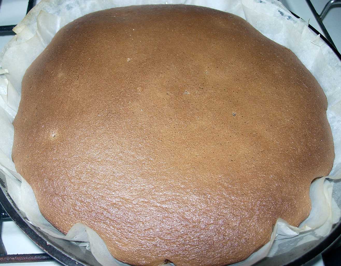 Во взбитые яйца введите муку, соду, ванилин и остывшую молочно-масляную массу. Затем добавьте какао, замесите однородное тесто для бисквита. Тесто выложите в жаропрочную форму и запекайте в духовке при 180 градусах 50-60 минут.
