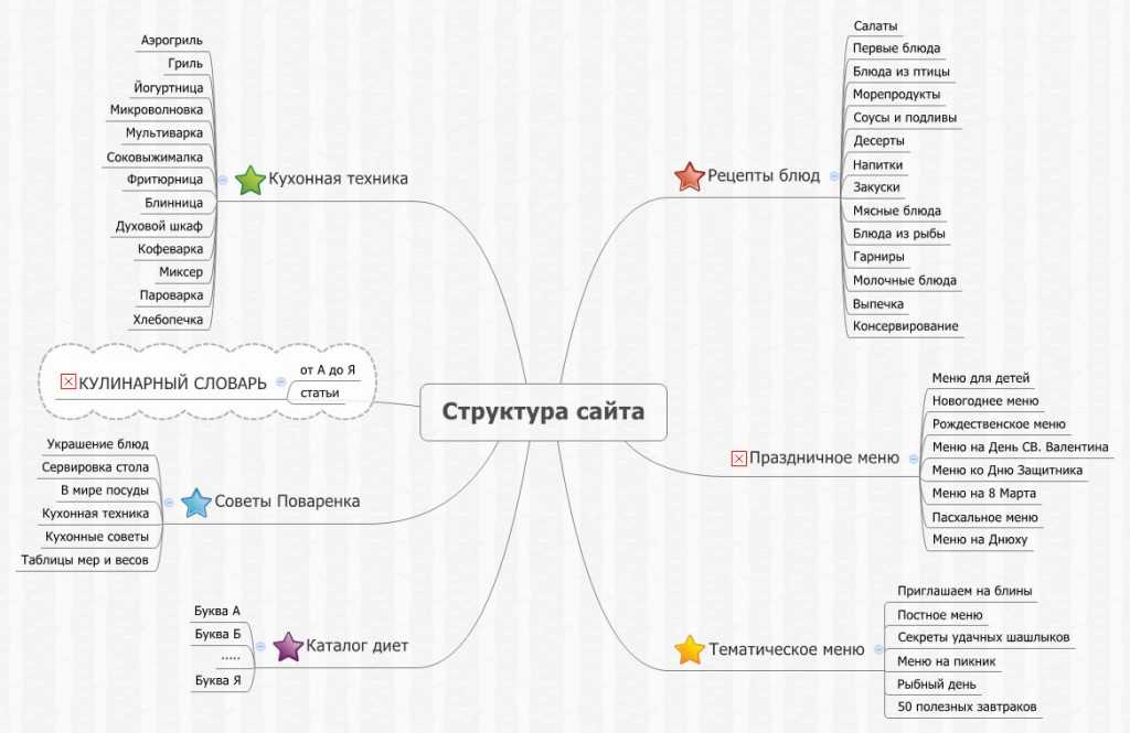 На этом этапе мы продумываем, какие рубрики, какие типы статей будут на нашем кулинарном блоге. Расписываем каждый элемент структуры, в деталях разбираем каждую статичную страницу. Все это можно сделать на бумаге, а можно использовать специальный софт по созданию интеллектуальных карт. С помощью них очень хорошо рисуется не только структурная схема.