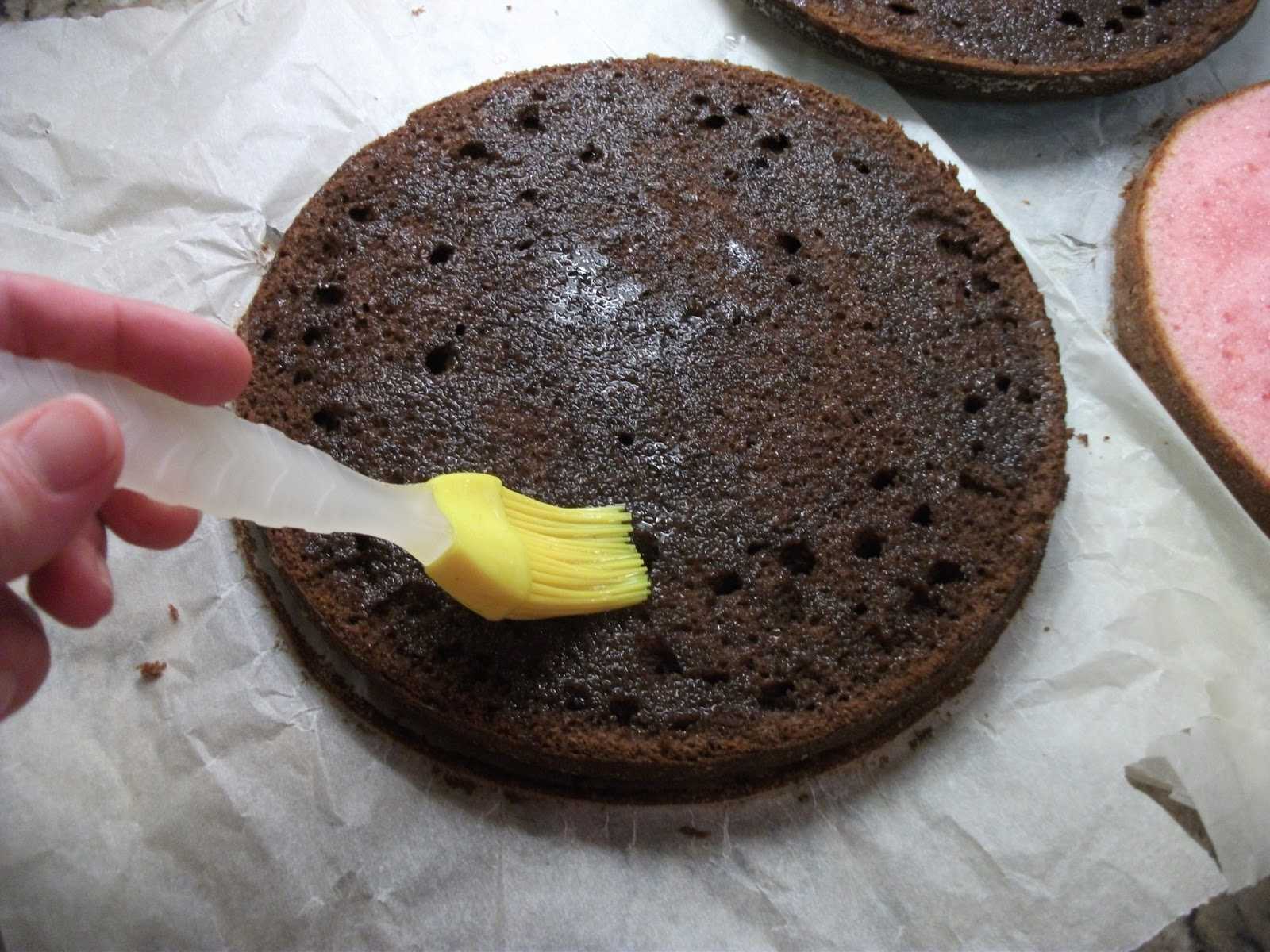 - Охладившийся корж пропитываем кофейно-коньячной смесью или понравившимся сиропом.