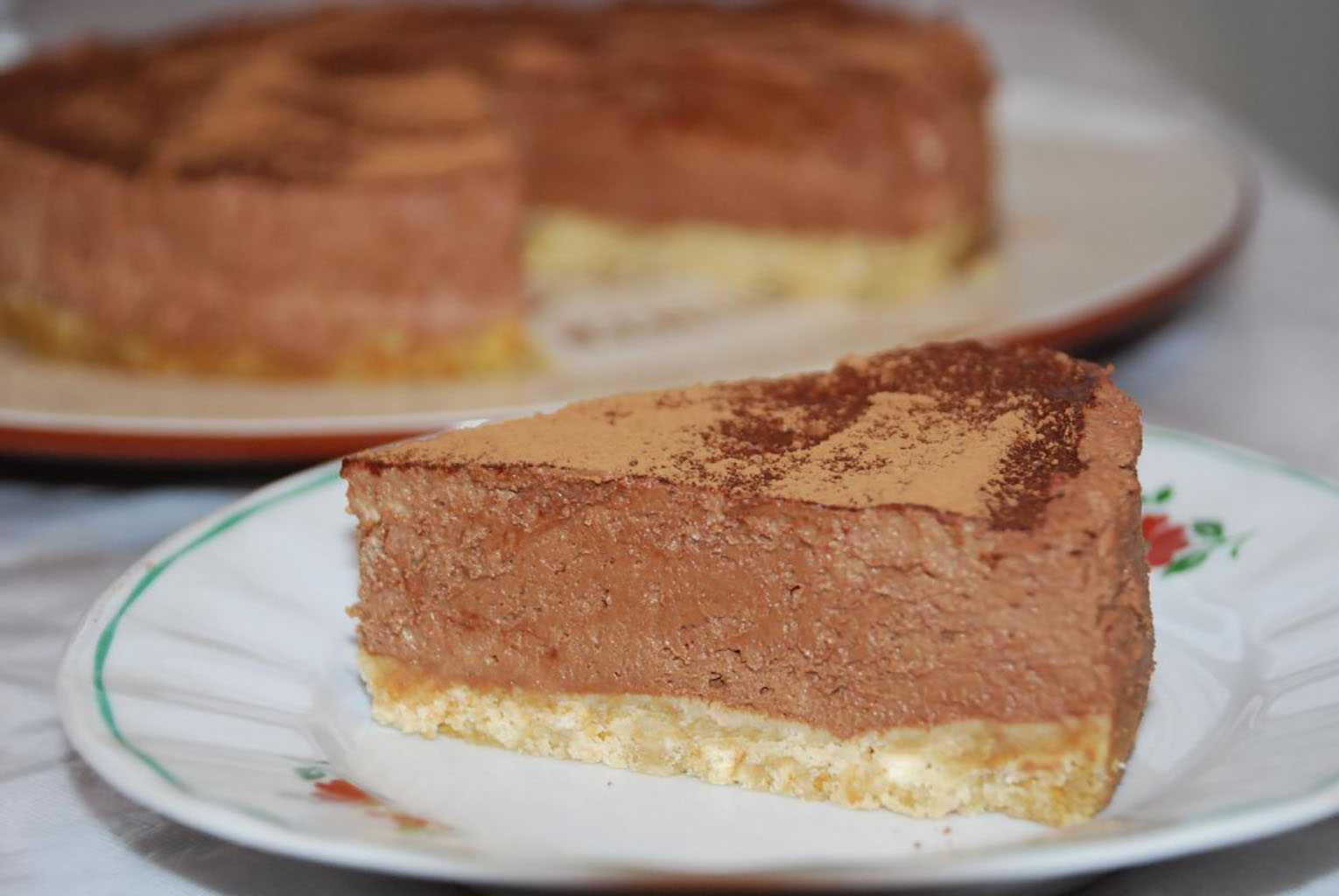 Разъемную форму с песочным основанием оберните снаружи фольгой, чтобы вода не попала в щели (обычно чизкейк выпекают на водяной бане). Но повышенная в сравнении с простым классическим чизкейком плотность шоколадного десерта позволяет пропустить этот пункт и готовить непосредственно в духовке (без бани). Благодаря наличию какао он равномерно пропечется при 120–130 градусах за 1,5–2 часа. На песочную основу вылейте сырную массу с шоколадом.