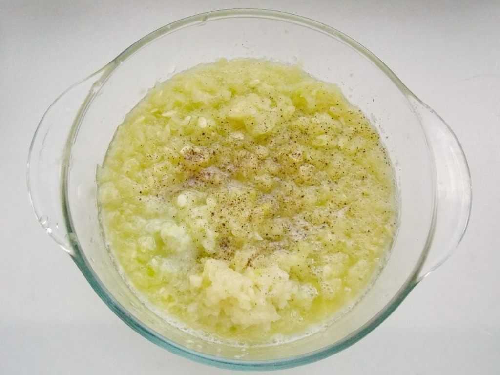 Перекручиваем на мясорубке кабачки и лук. Сок сливать не нужно.