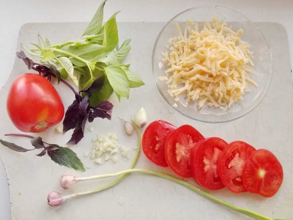 Отдельно натрём на крупной тёрке сыр. Помидоры нарежем кружочками толщиной 2-3 мм.