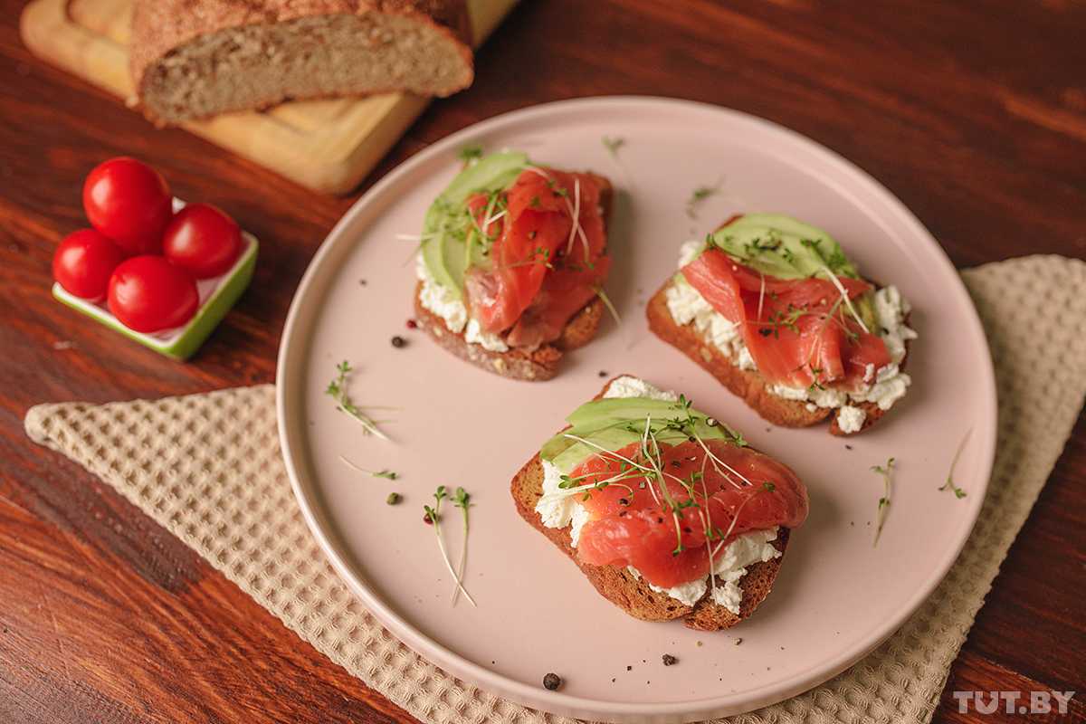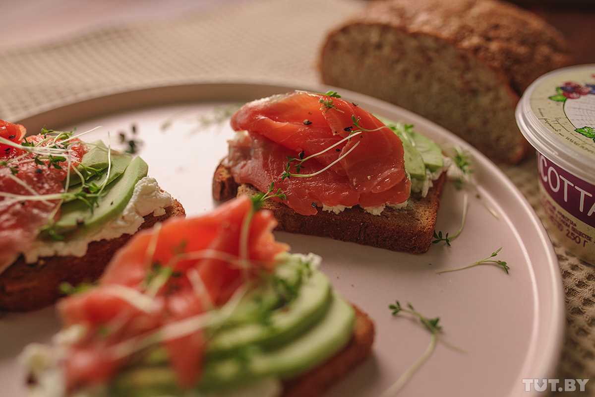 2. Положите на слой рикотты ломтики авокадо и лосося.