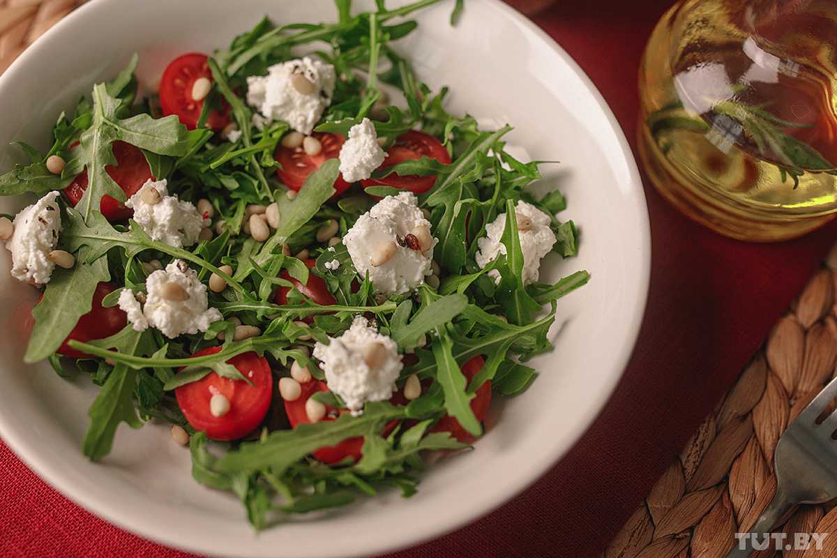 1. Рукколу крупно измельчите руками, черри разрежьте пополам.