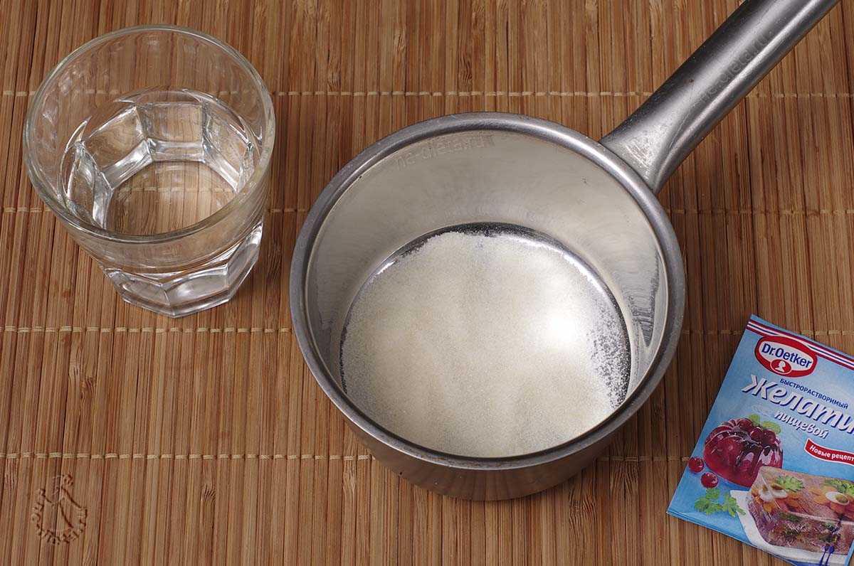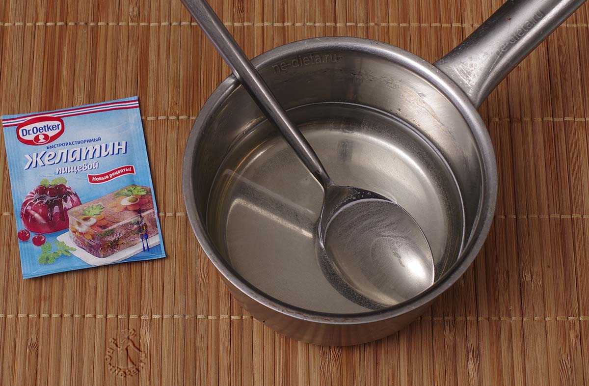 - Теперь желатин необходимо растворить в небольшом количестве воды и оставить для набухания. Нужно взять приблизительно 80 миллилитров воды.