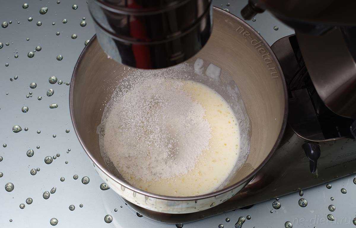 3. Всыпать в тесто муку, просеянную с разрыхлителем.