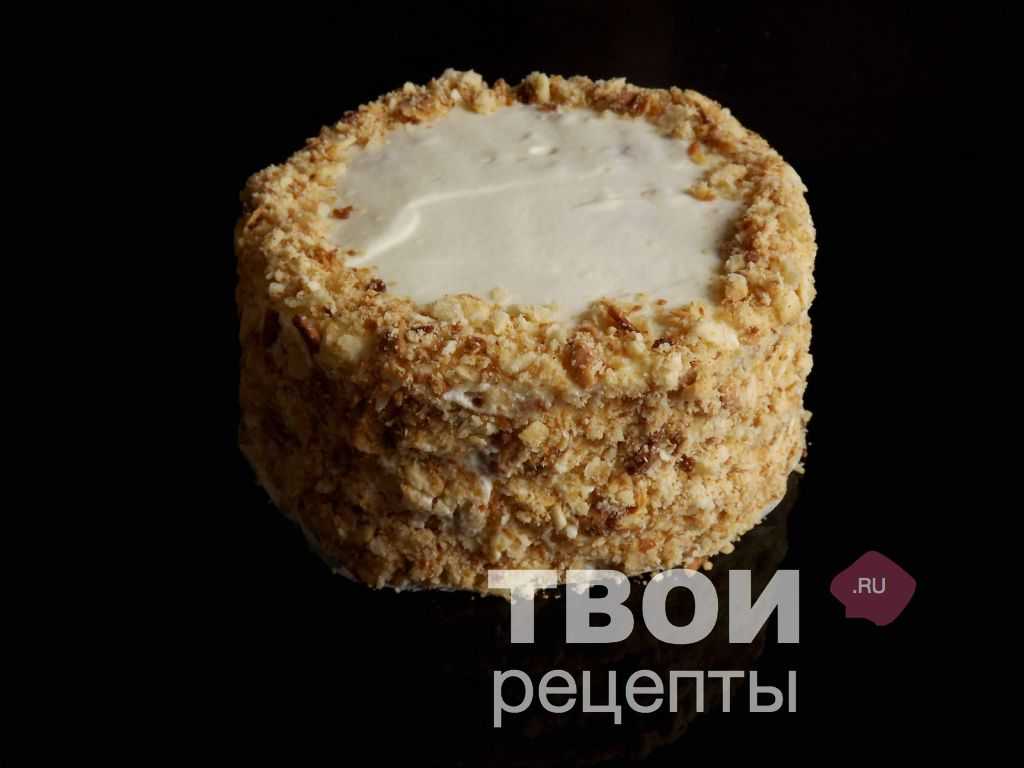 - Коржи промажьте кремом и сложите их друг на друга. Торт посыпьте песочной крошкой. Наполеон поставьте в холодильник на 8-10 часов для пропитки. Торт получается очень нежным и вкусным.