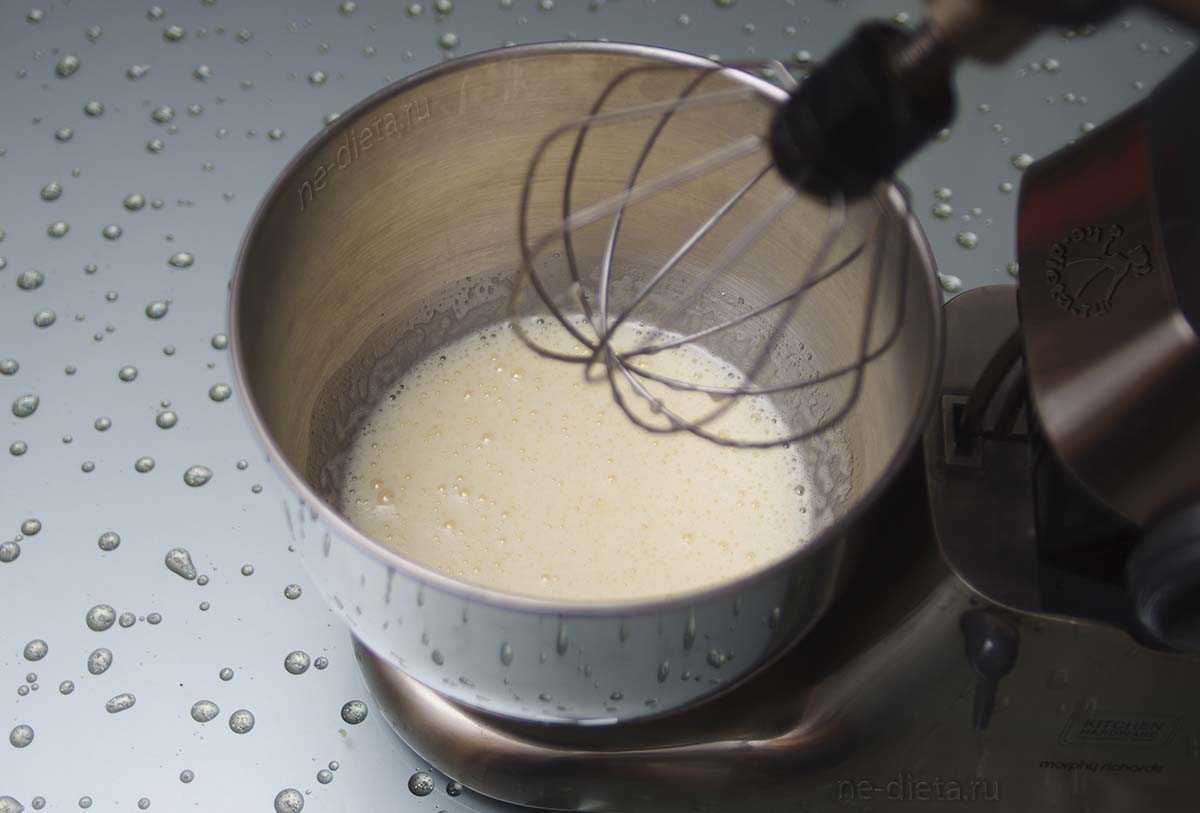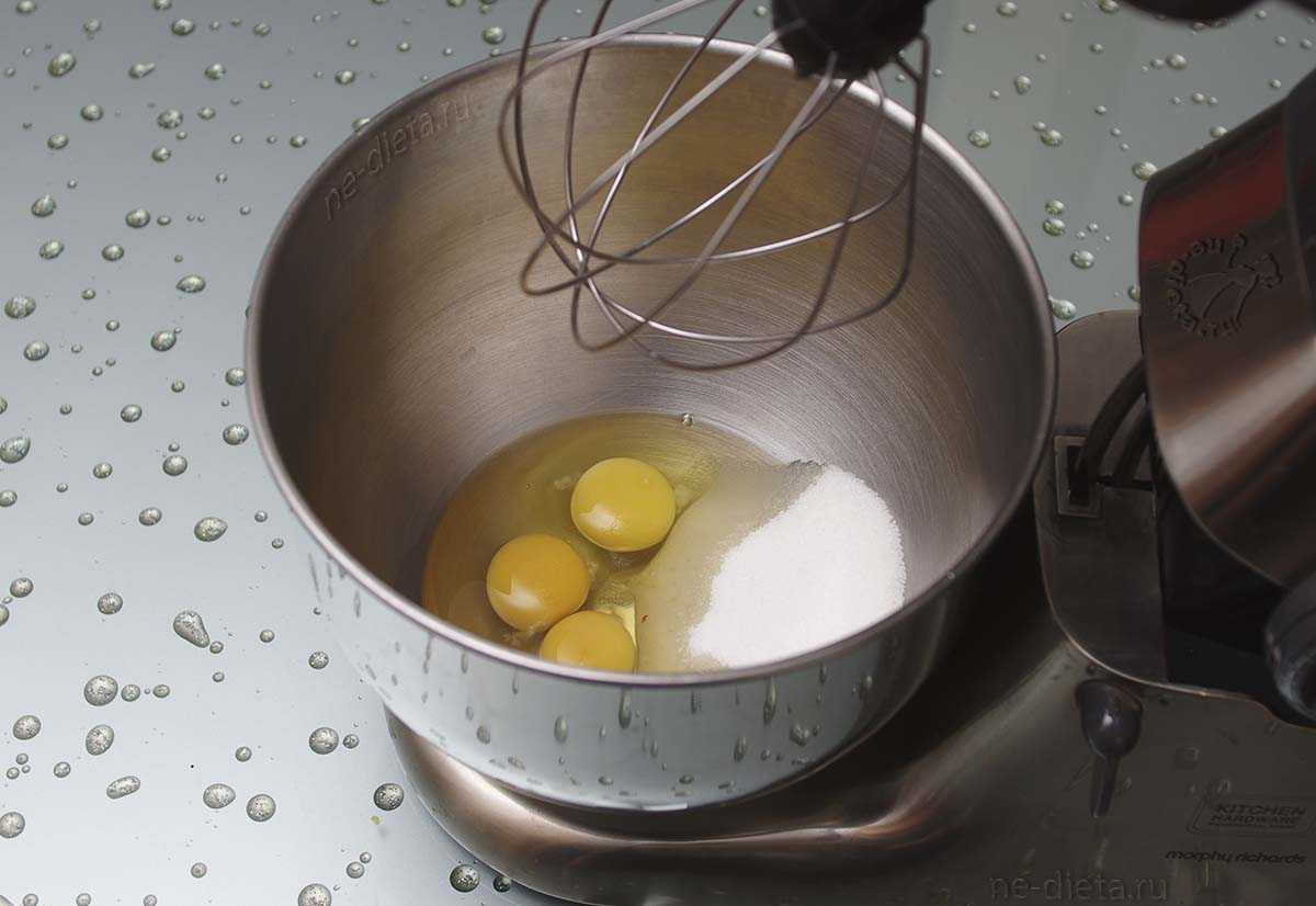 2. Взбить яйца с сахаром в пышную массу на максимальной скорости миксера или комбайна в течение 5 – 7 минут.