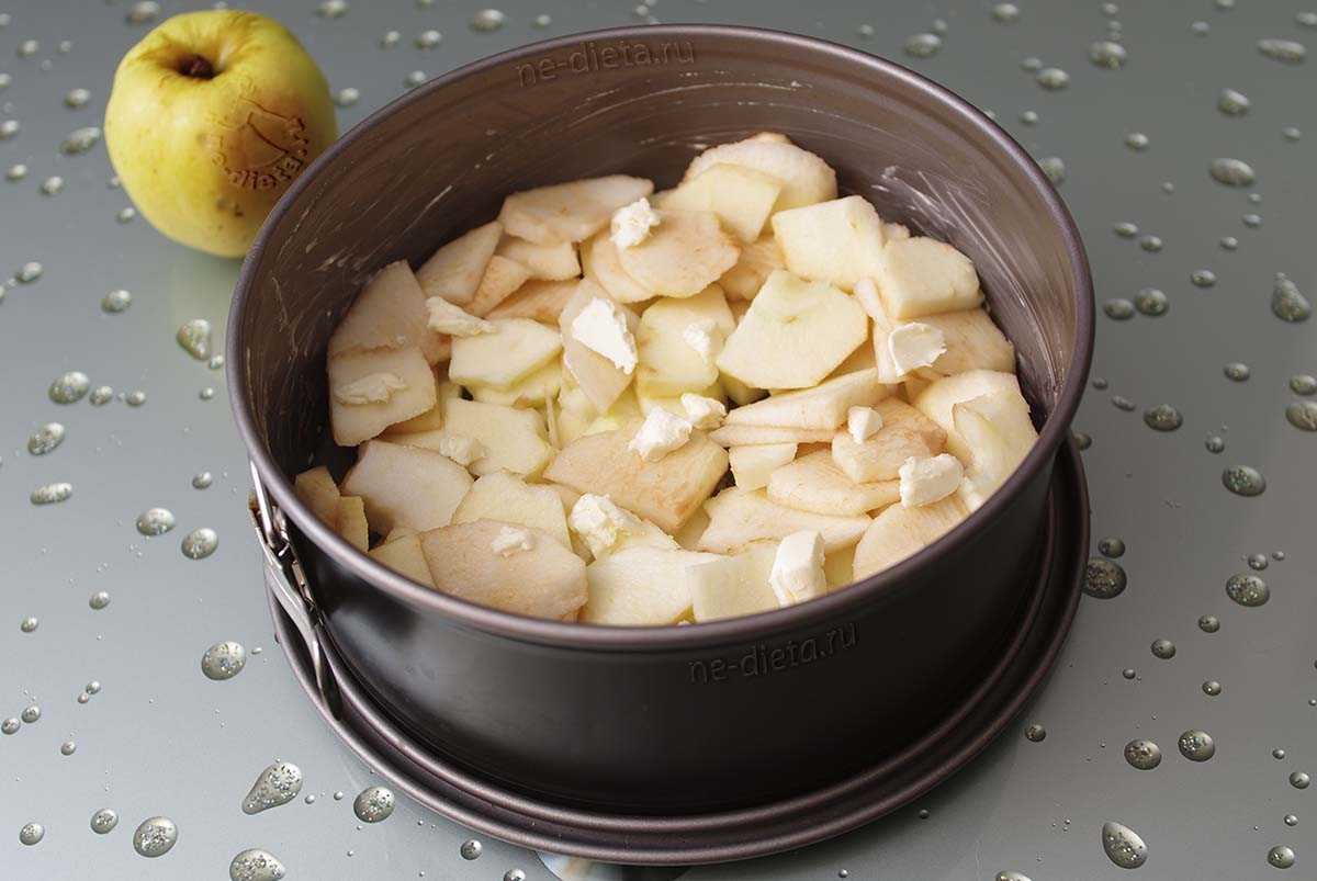 6. На яблоки вылить половину теста, затем выложить все оставшиеся яблоки и кусочки сливочного масла, после чего залить остатки теста. Несколько раз постучать формой по столу, чтобы тесто утрамбовалось и из него вышел лишний воздух.