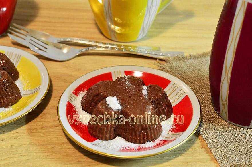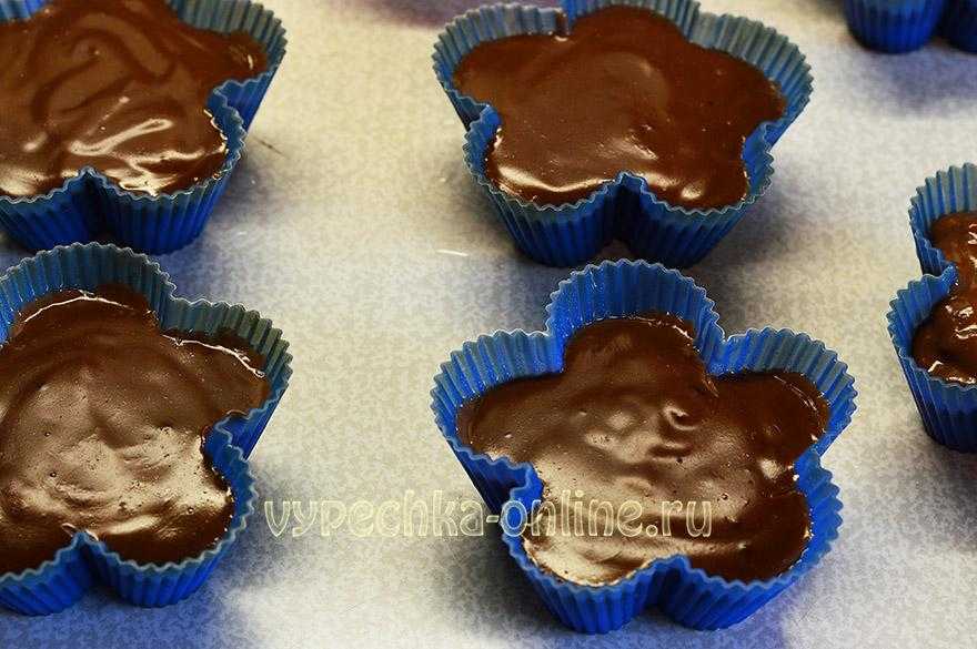 Силиконовые формочки для кексов (у меня получилось 9 штук) сбрызнула холодной водой. Залила в них горячую шоколадную массу.