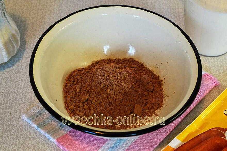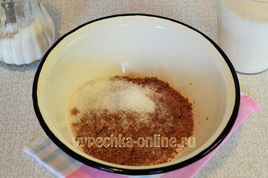 - В большую миску насыпьте стакан сахара, добавьте туда же 4 столовых ложки порошка какао, 2 столовые ложки картофельного крахмала и 1 яичный желток. Разотрите полученную массу до однородного состояния.