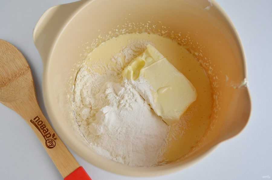3. Добавьте мягкое сливочное масло, муку и разрыхлитель. Замесите мягкое пластичное тесто.