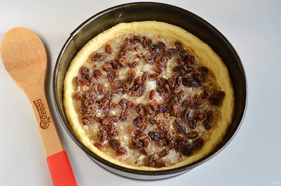 9. Достаньте тесто из холодильника. Распределите сверху лимонно-ореховую начинку, изюм.