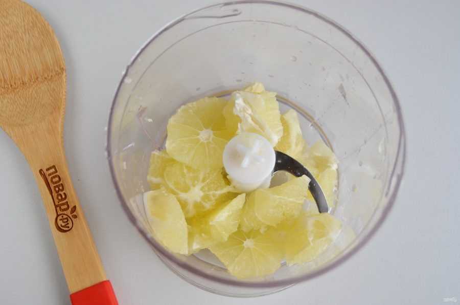 6. Лимоны очистите от кожуры, порежьте кусочками, удалите косточки. Измельчите с помощью блендера, можно пропустить через мясорубку.