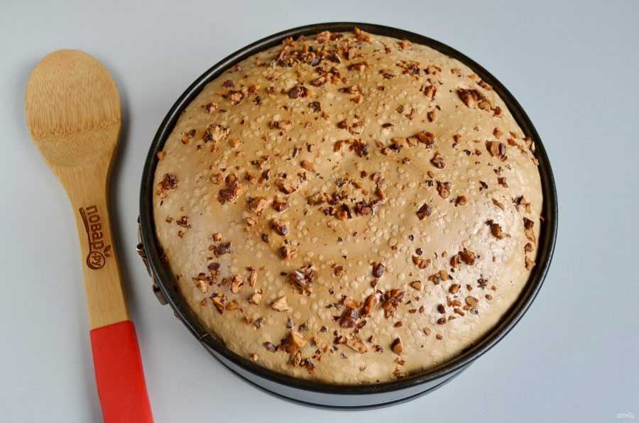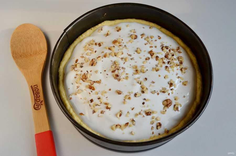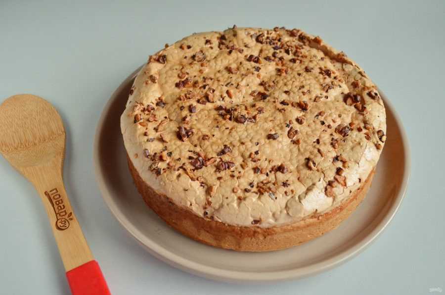 10. Далее положите слой безе, сверху украсьте орешками. Поставьте пирожное в разогретую до 160 градусов духовку на 50-55 минут.